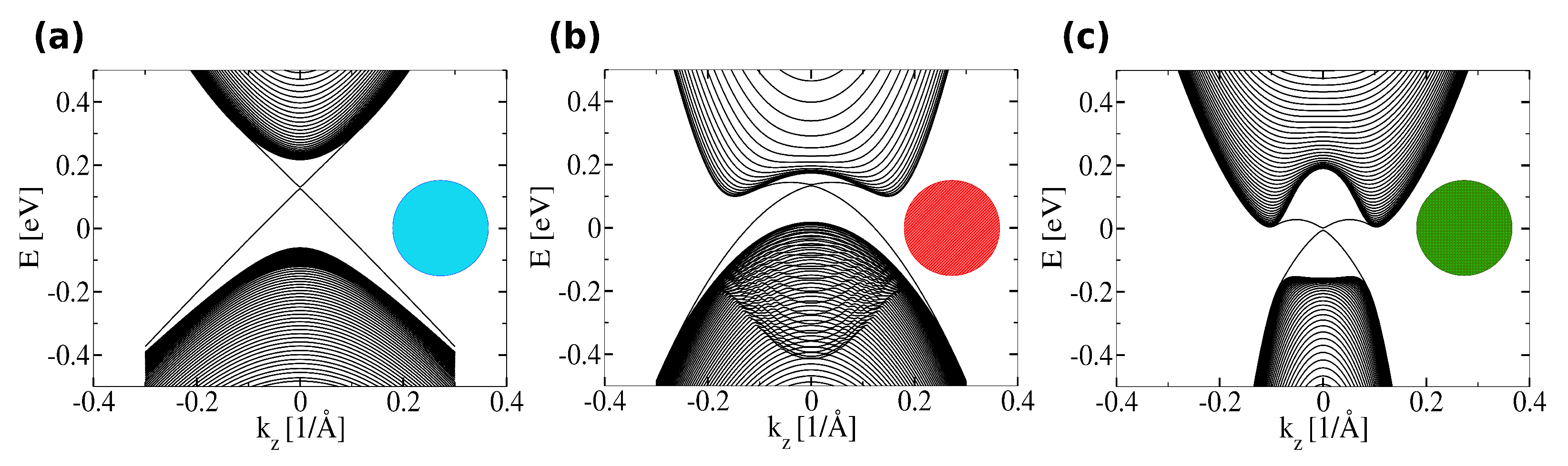 Figure 2. Energy spectrum as a function of the z-component of the wavevector, k z , for cylindrical systems composed of a single topological insulator. The calculation was performed using a basis of N = 40 functions. Only the energy for the angular momentum L = 0 is shown. Each material is represented with a distinct color and fill pattern: (a) B i 2 S e 3 (blue, solid fill); (b) B i 2 T e 3 (red, striped); and (c) S b 2 T e 3 (green, dotted).