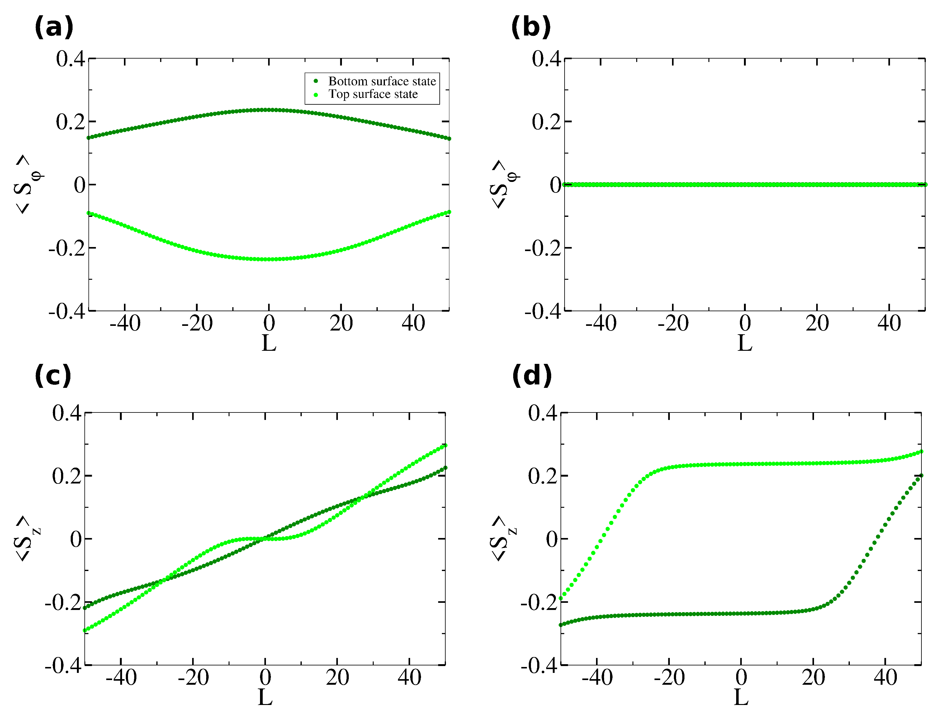 Figure 3. Spin orientations as a function of angular momentum L for a solid cylinder made entirely of B i 2 S e 3 with radius R = 60 nm . Panel (a) shows the expectation value of the azimuthal spin component S ϕ at k z = 0.1 ; panel (b) shows S ϕ at k z = 0 ; panel (c) shows the expectation value of the z-component S z at k z = 0.1 ; and panel (d) shows S z at k z = 0 . The lowest-energy surface state is shown in dark green, while the highest-energy surface state is shown in light green.