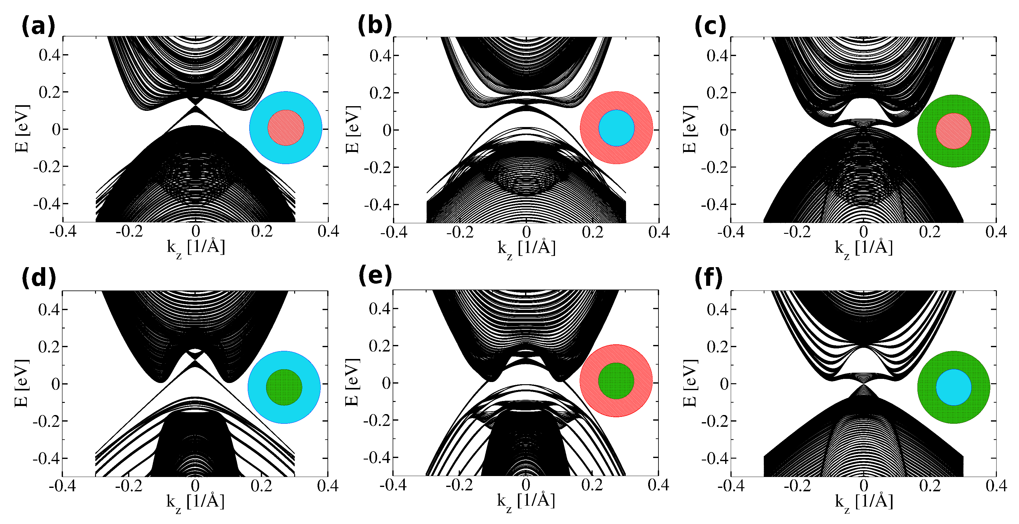 Figure 4. Energy spectra as a function of the wavevector component along the cylinder axis, k z , for concentric cylindrical heterostructures composed of two topological insulators. In each panel we include eigenvalues calculated using the first ten angular momentum values L = 0 , 1 , , 9 . Each panel corresponds to a different core–shell material combination, with the core located at the center and the shell surrounding it. (a) B i 2 T e 3 core and B i 2 S e 3 shell; (b) B i 2 S e 3 core and B i 2 T e 3 shell; (c) B i 2 T e 3 core and S b 2 T e 3 shell; (d) S b 2 T e 3 core and B i 2 S e 3 shell; (e) S b 2 T e 3 core and B i 2 T e 3 shell; (f) B i 2 S e 3 core and S b 2 T e 3 shell. A transverse cross-section is shown in each case, with color coding used to distinguish the materials.
