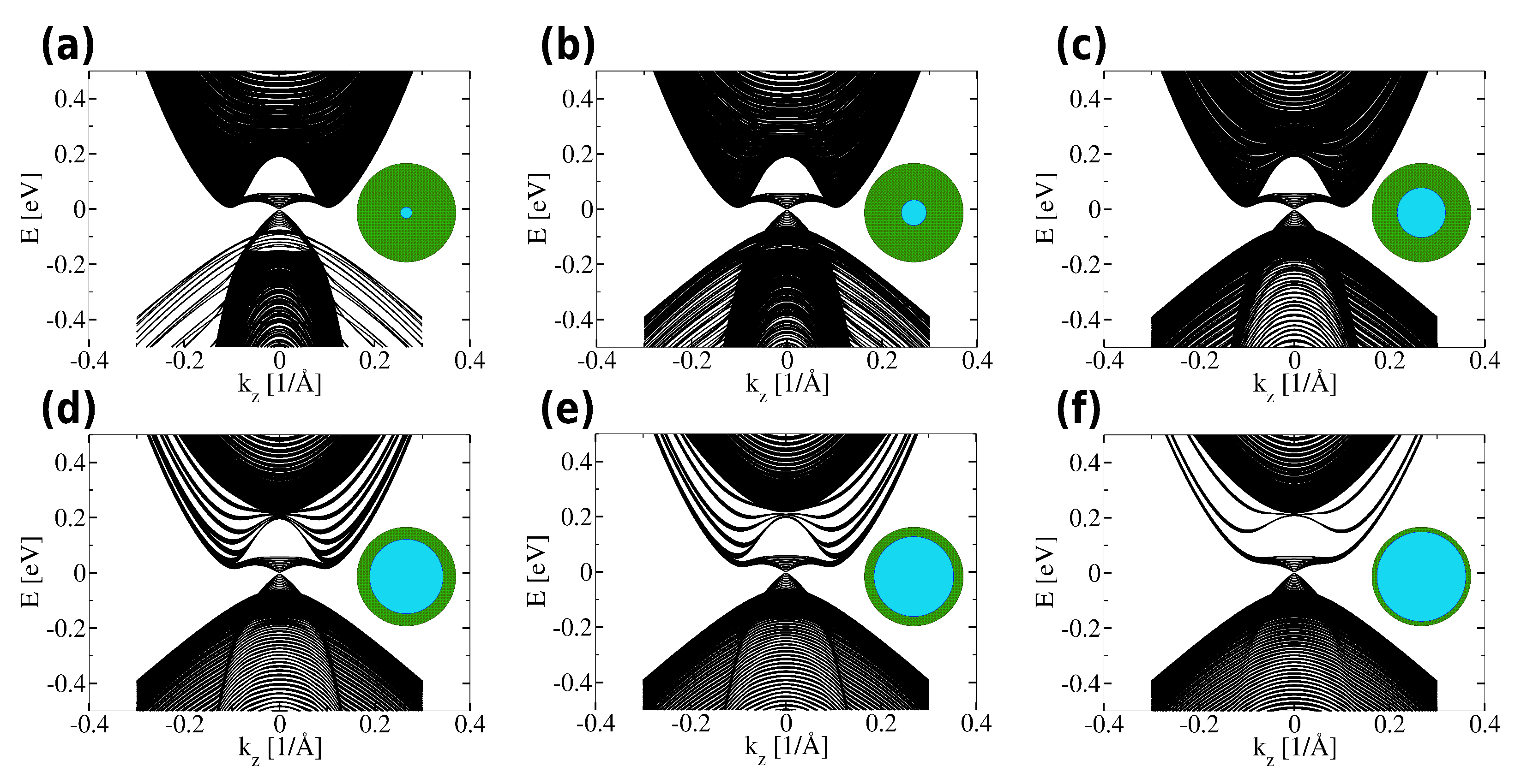 Figure 5. Energy spectra as a function of the z-component of the wavevector, k z , for cylindrical core–shell structures composed of B i 2 S e 3 as the core and S b 2 T e 3 as the shell, with varying core radii. The spectra are shown for 10 different angular momentum values. Panels (af) correspond to increasing inner radii R i , given as a percentage of the outer radius R e : (a) R i = 0.1 R e ; (b) R i = 0.25 R e ; (c) R i = 0.5 R e ; (d) R i = 0.75 R e ; (e) R i = 0.8 R e ; (f) R i = 0.9 R e . The core–shell geometry for each configuration is illustrated with an inset image in each panel.