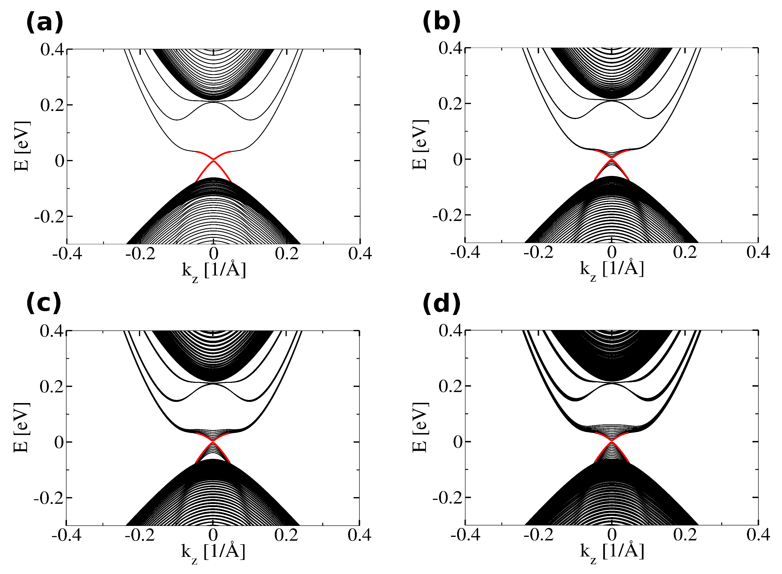 Figure 6. Energy spectra obtained with increasing numbers of angular momentum states in a cylindrical core–shell structure composed of B i 2 S e 3 in the core and S b 2 T e 3 in the shell, with inner radius R i = 54 [nm] and outer radius R e = 60 [nm] (see Figure 5f). Panels (ad) show the progressive inclusion of higher angular momentum components: (a) L = 0 only; (b) L = 0 to L = 4 ; (c) L = 0 to L = 6 ; (d) L = 0 to L = 9 . The red curves correspond to the energy of the surface states with angular momentum number L = 0 .
