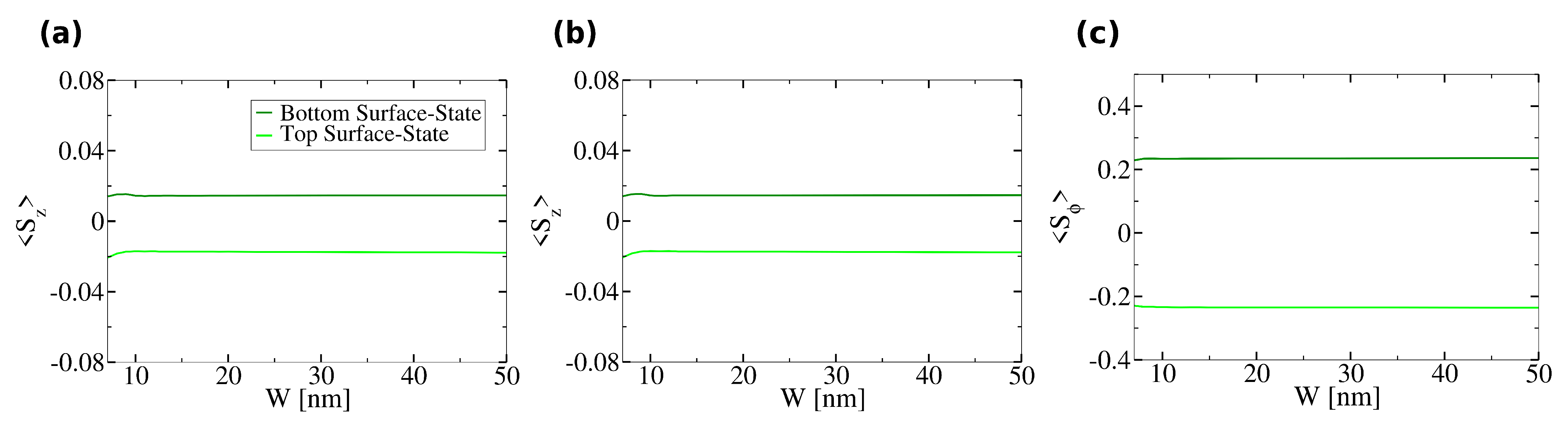 Figure 7. Spin orientations as a function of shell width W for a concentric cylindrical heterostructure composed of S b 2 T e 3 in the core and B i 2 S e 3 in the shell, with outer radius R e = 60 nm and angular momentum L = 0 . Panel (a) shows the expectation value of the z-component of the spin, S z , at k z = 0 ; panel (b) shows S z at k z = 0.02 ; and panel (c) shows the azimuthal component S ϕ at k z = 0.02 . The lowest-energy edge state is shown in dark green and the highest-energy edge state is shown in light green.