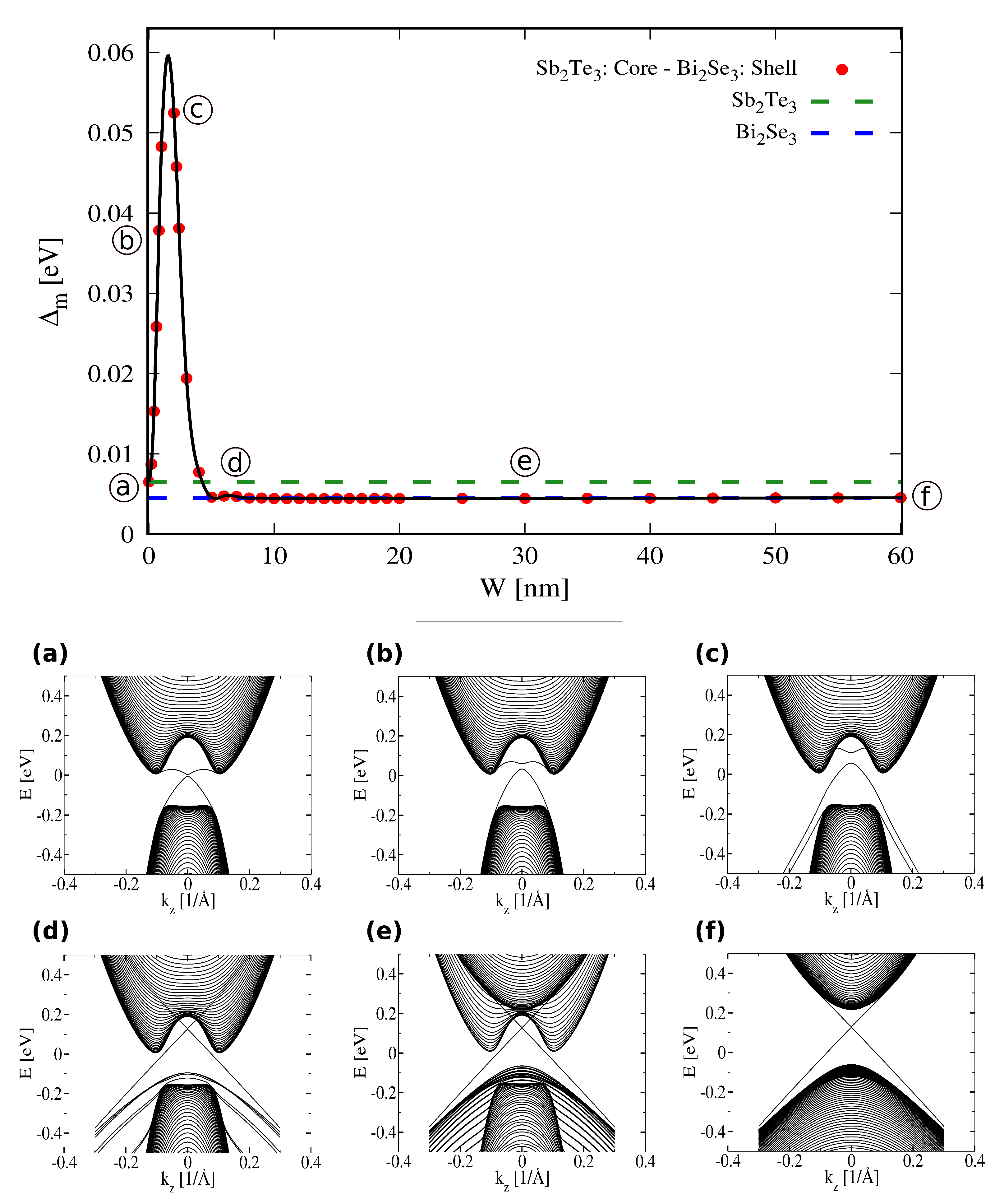 Figure 8. Energy gap between edge states as a function of shell width W in a cylindrical core–shell structure with B i 2 S e 3 in the core and S b 2 T e 3 in the shell. Blue dots indicate the calculated gap values for each W, while the solid line corresponds to a polynomial fit. A truncated basis of N = 40 functions was used, with fixed outer radius R e = 60 [nm], L = 0 and k z = 0 . Panels (af) show selected configurations corresponding to representative values of W: (a) W = 0 (fully S b 2 T e 3 ); (b) W = 0.6 [nm]; (c) W = 2 [nm]; (d) W = 7 [nm]; (e) W = 30 [nm]; (f) W = 60 [nm] (fully B i 2 S e 3 ).