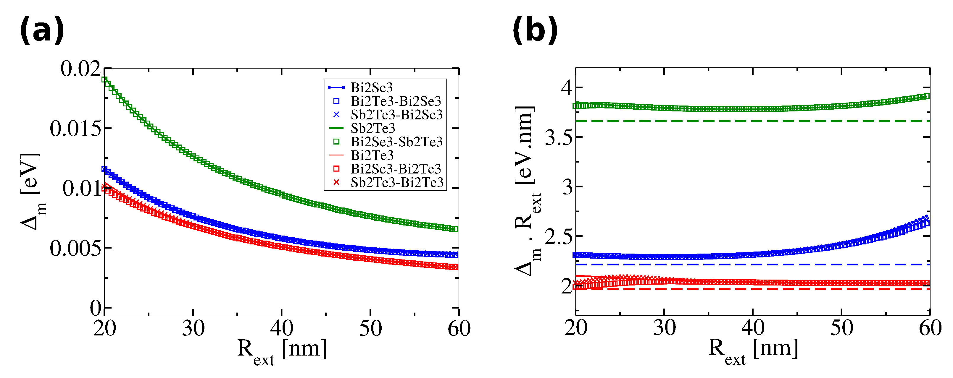 Figure 9. (a) Energy gap as a function of the outer radius R e for cylindrical core–shell structures with different material combinations in the core and shell. Each of the three sets of curves is represented by a different color, corresponding to a specific pair of topological insulators. The gap is evaluated at k z = 0 , using a truncated basis of N = 40 states and angular momentum L = 0 . One material combination is omitted for clarity. (b) Scaled energy gaps Δ m × R e as a function of R e . The dashed lines correspond to the analytical expression for the azimuthal Fermi velocity, v φ F = A 0 1 C 2 / M 2 2 (according to Ref. [19]), using the same color code as in panel (a) for each material combination. This comparison illustrates the asymptotic agreement between the numerically computed gaps and the effective surface-state velocity in the large-radius limit.