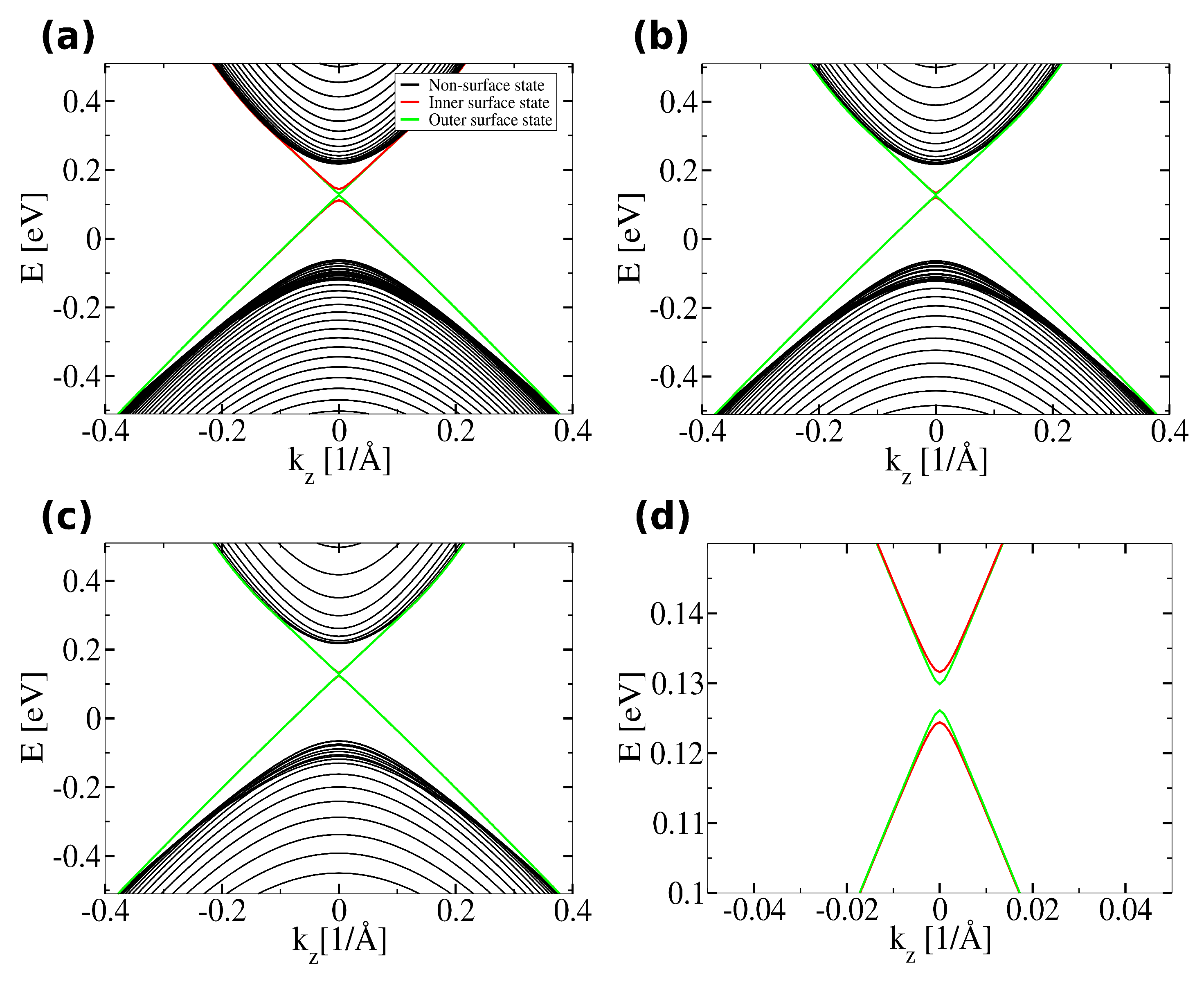 Figure 11. Energy spectrum as a function of the z-component of the wavevector for different inner radii of a hollow cylinder made of B i 2 S e 3 . The outer radius is fixed at R e = 60 nm and the basis consists of N = 40 functions. Panel (a) corresponds to an inner radius R i = 0.1 R e ; (b) to R i = 0.3 R e ; and (c) to R i = 0.5 R e . Panel (d) shows a zoom-in of the gap region in (c). Surface states located at the outer boundary are shown in green, inner surface states in red and bulk states in black.