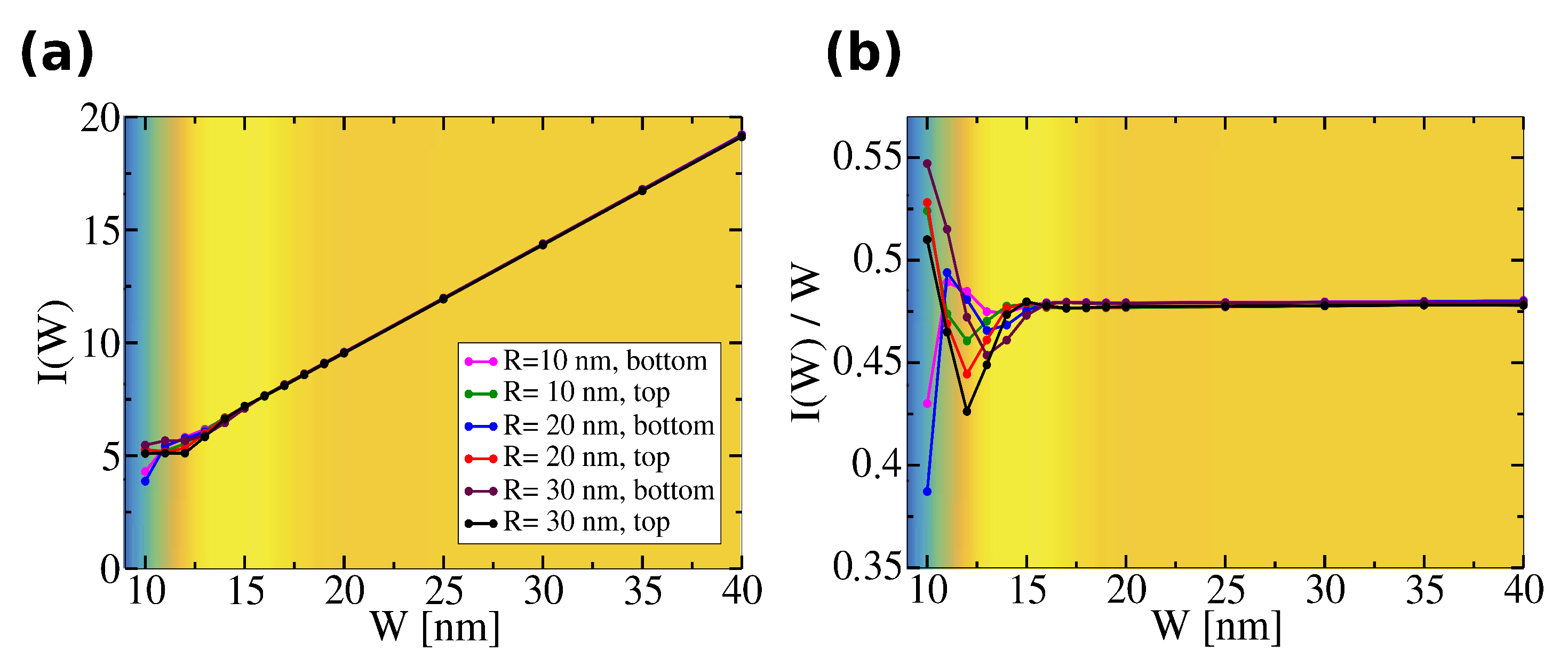Figure 13. Inverse Participation Ratio (IPR), denoted as I ( W ) , as a function of shell width W for a hollow cylinder at fixed longitudinal wavevector k z = 0 . Calculations were performed using N = 40 basis functions and angular momentum L = 0 . Results are shown for three different inner radii: R i = 10 nm , 20 nm , and 30 nm , as indicated in the legend. In panel (a), the background color map represents the variation of the parameter v z x ϕ as defined in Ref. [20], allowing for a visual comparison between this quantity and the IPR. Panel (b) shows a rescaled version of the IPR as a function of W, in order to better highlight its variation relative to v z x ϕ , emphasizing the correspondence between localization behavior and the features of the referenced parameter.