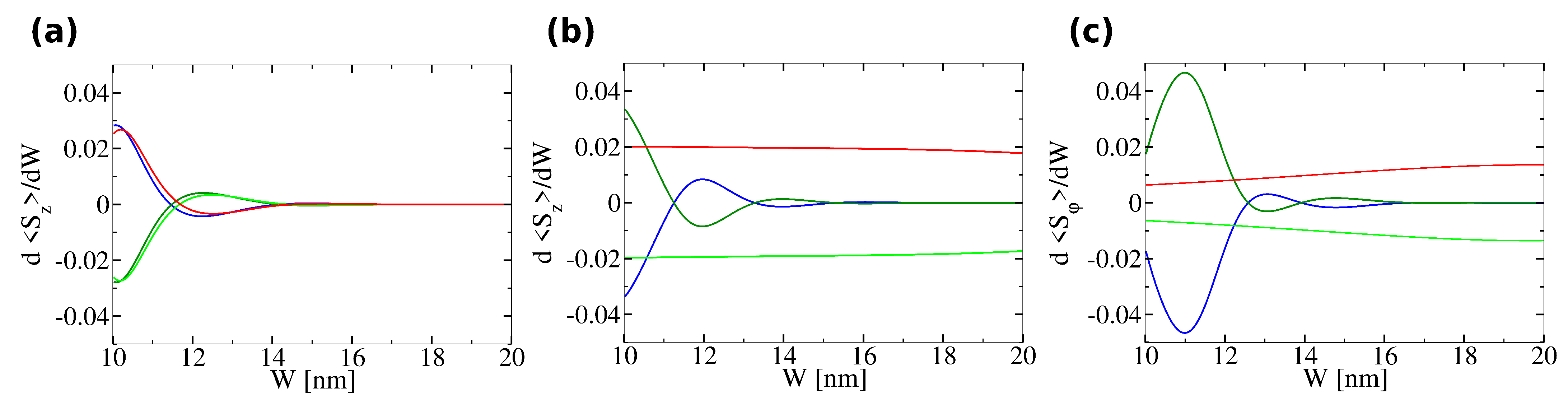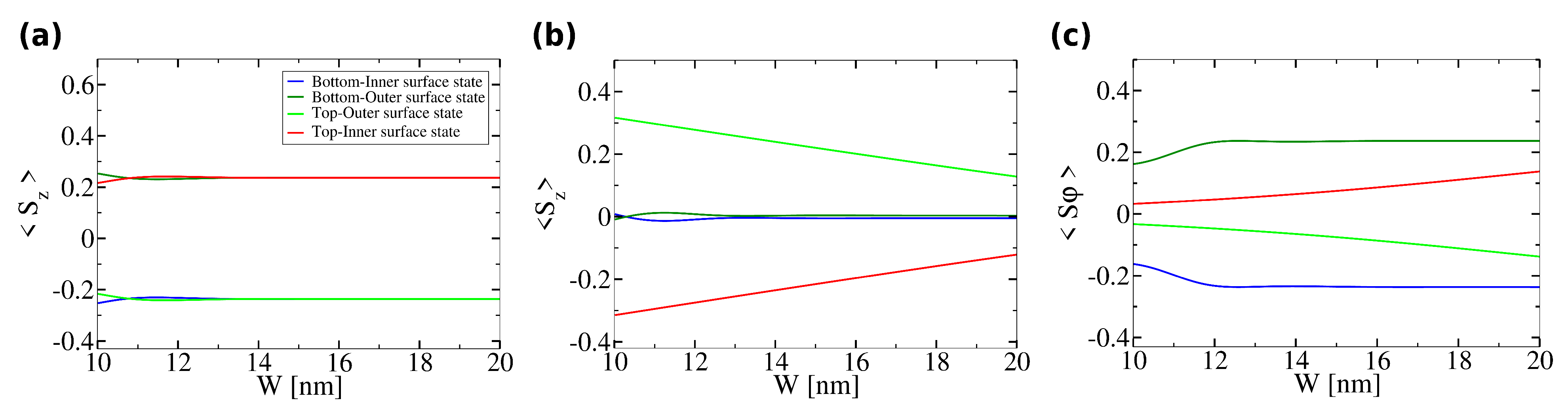 Figure 14. Spin orientations as a function of shell width W for a B i 2 S e 3 hollow cylinder with outer radius R e = 60 nm and angular momentum L = 0 . Panel (a) shows the expectation value of the z-component of the spin, S z , at k z = 0 ; panel (b) shows S z at k z = 0.1 ; and panel (c) shows the azimuthal component S ϕ at k z = 0.1 . The lowest-energy inner edge state is shown in blue, the lowest-energy outer edge state in dark green, the highest-energy inner edge state in red and the highest-energy outer edge state in light green.