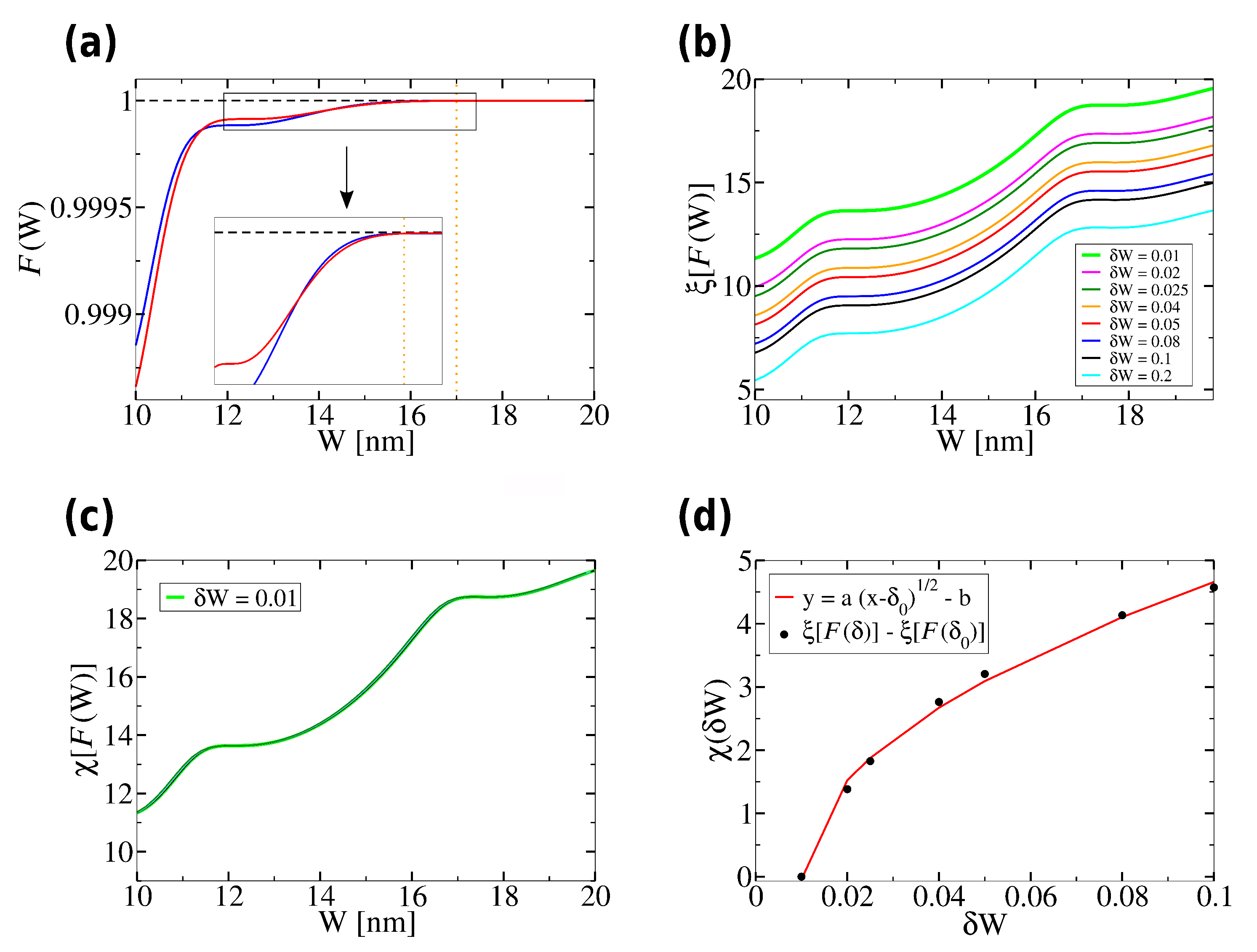 Figure 15. Quantum fidelities as a function of shell width W for a hollow B i 2 S e 3 cylinder with fixed outer radius R e = 60 nm . Panel (a) shows the fidelity F ( W ) for a variation δ W = 0.01 , where the lowest-energy inner surface state is shown in blue and the highest-energy inner surface state is shown in red. A zoom-in of the region near a fidelity transition (around the orange dashed line at W = 17 ) is included. Panel (b) shows the auxiliary function ξ ( F ( W ) ) for various values of δ W , computed for the lowest-energy inner surface state. Panel (c) presents a data collapse of the ξ ( F ( W ) ) curves, revealing a common scaling behavior. Panel (d) shows a quadratic-root fit of the scaling function χ ( δ W ) for the highest-energy outer surface state. Black dots represent the numerical values of χ ( δ W ) , and the red curve corresponds to a nonlinear fit of the form χ ( δ W ) = a δ W + b . The fitted parameters are a = 15.67 and b = 0.04 .