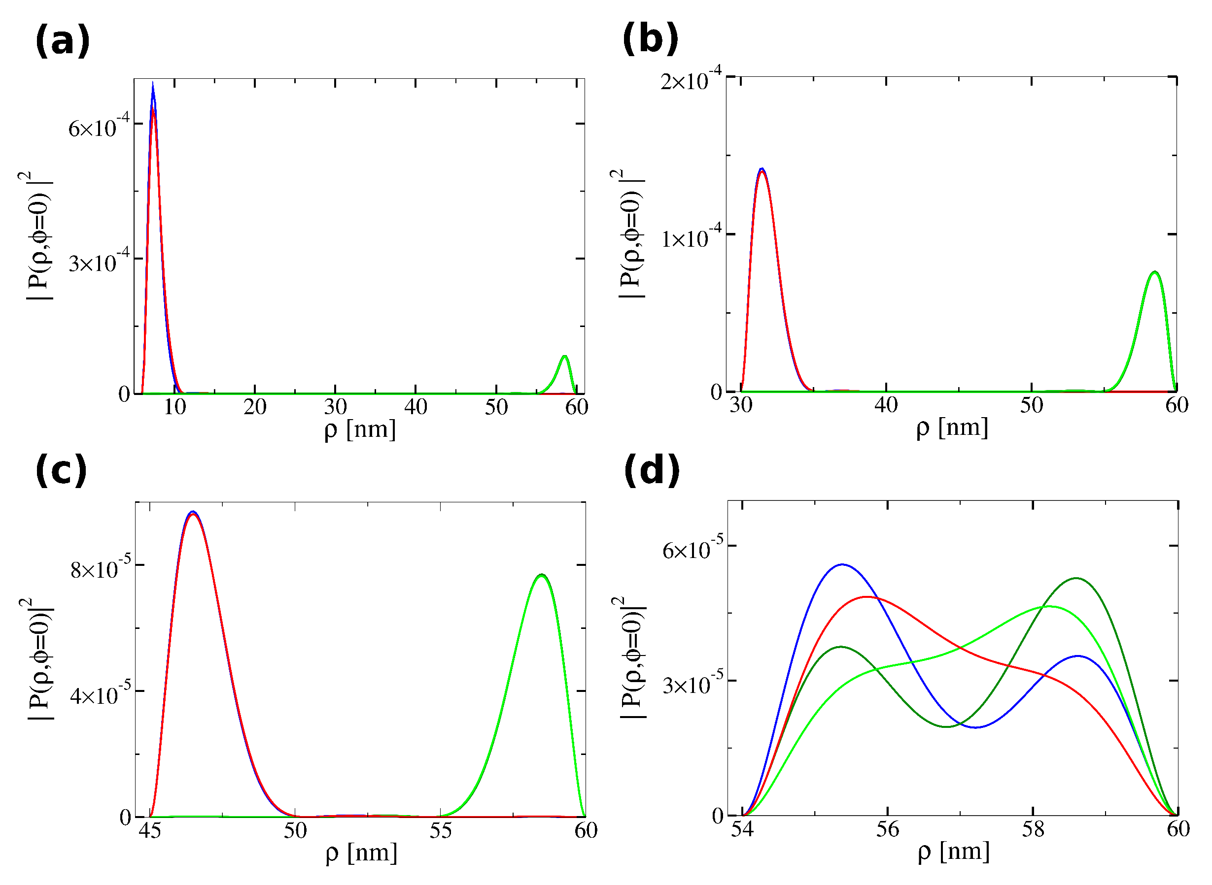 To calculate the expectation values employed in the variational method, it is necessary to exercise some caution as the hard-wall approximation imposes a discontinuity on the parameters of the Hamiltonian. Since this discontinuity is in the radial coordinate, all terms in the Hamiltonian that depend on this coordinate should be analyzed. We present the mathematical details concerning the modifications introduced by a discontinuity in the Hamiltonian coefficients in Appendix B. Beyond these modifications, the numerical implementation proceeds along the lines described previously. The trial functions employed for the numerical calculations are the same as used in the previous subsection; see Equation (8).