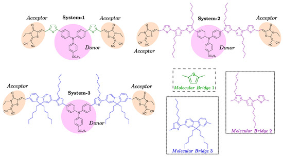In this work, we consider an organic molecular system as depicted in Figure 1. Each molecule is classified into three fragments: a central unit acting as an electron donor, molecular bridges that facilitate charge transfer, and terminal groups serving as electron acceptors. In these systems, we use the structure of 4-Hexyloxy-Triphenylamine (TPA) as the electron donor fragment, which consists of a triphenylamine core connected to the electron acceptor fragment 2-(1,1-Dicyanomethylene)-1,3-thiazolene-4 (DCR) through molecular bridges (B). Different molecular bridges are employed for the design of new push-pull chromophores, such as 2,5-Dimethylthiophene (B1), 4,4″-Dihexyl-2,2′:5′,2″-Terthiophene (B2), and 2-(9,9-Dihexyl-9H-Fluoren-2-yl)hexylthiophene (B3), to create (System-1), (System-2), and (System-3), respectively. The choice of molecular bridges is based on their ability to enhance -conjugation and facilitate efficient charge transfer between the donor and acceptor units. The incorporation of 2,5-dimethylthiophene and fluorenyl-thiophene bridges is expected to reduce the energy gap and improve electron mobility, as has been observed in similar systems with more conjugated -bridges [16,17,18].
