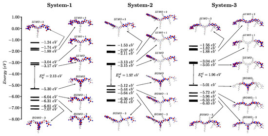 Energy level diagram of the Kohn–Sham orbitals of the System-1, System-2, System-3 dyes calculated using density functional theory (DFT) for the EtOH solvent.