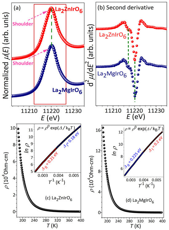 (a) Ir L3-XANES (X-ray absorption near edge structure) spectra for the two samples; (b) second derivative curves of the respective normalized absorption spectra, indicating white-line features more prominently. The green-dashed lines correspond to Ir 2p → t2g (lower-energy) and Ir 2p → eg (higher energy) transitions; Temperature dependence of electrical resistivity for (c) La2ZnIrO6 and (d) La2MgIrO6. Inset: corresponding Arrhenius fitting.