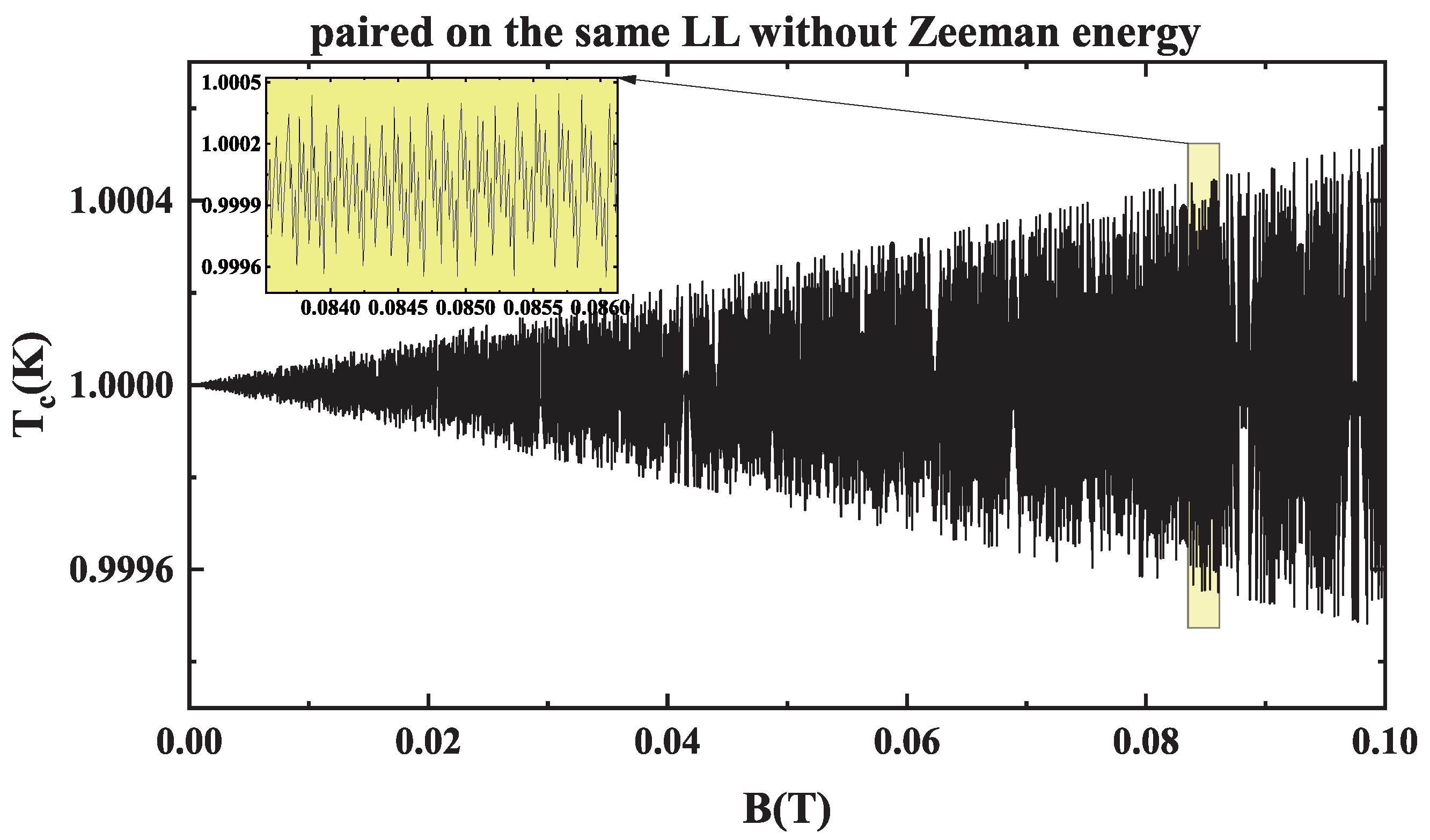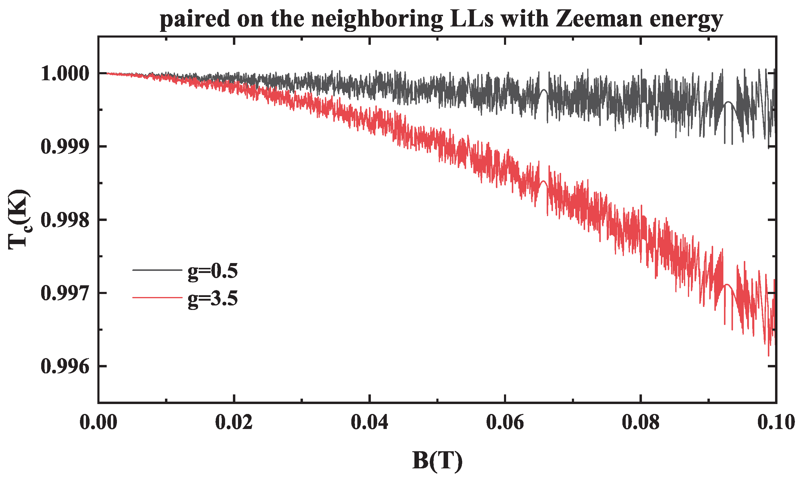 These results highlight a key feature of the two-dimensional system: when the g-factor is small, the critical temperatures associated with Cooper pairs formed on the same and neighboring LLs differ only slightly. This behavior contrasts sharply with that of three-dimensional systems, where the additional degree of freedom along the magnetic field direction, through its continuous dispersion, enhances the disparity between these pairing channels [