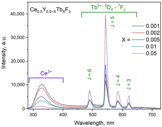 It can be seen that the peak position weakly depends on Tb3+ content, probably because Tb3+ and Y3+ have similar ionic radii. The CSD sizes are slightly smaller than the physical diameters (d). This can be explained by the fact that the Scherrer equation takes into consideration size effects only. However, in the obtained samples, Ce3+ and Y3+ have different ionic radii, and the samples probably contain tensions. These tensions, additionally, broaden the XRD peaks. The room temperature luminescence spectra of the Ce0.5Y0.5−XTbXF3 (X = 0.001; 0.002; 0.005; 0.01; 0.05) samples are presented in Figure 4. The spectra are normalized at the 544 nm peak of Tb3+. The 266 nm excitation wavelength corresponds to the 4f–5d absorption band of Ce3+.