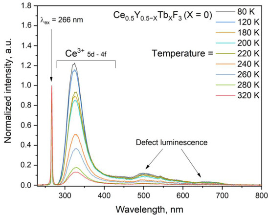 The normalized at 266 nm luminescence spectra of Ce0.5Y0.5−XTbXF3 (X = 0) (without Tb3+) under 266 nm excitation (4f–5d absorption band of Ce3+ ions) are presented in Figure 5. The spectra were recorded in the 80–320 K temperature range.
