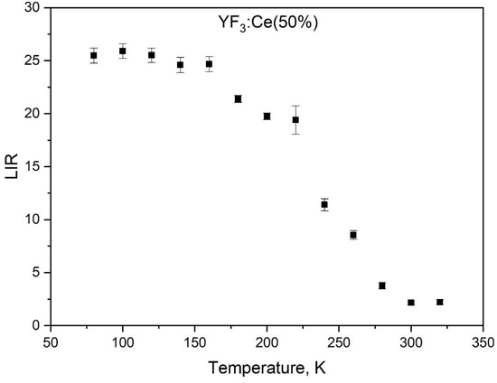 The LIR function of the Ce0.5Y0.5−XTbXF3 (X = 0, 0.001, 0.002, 0.005, 0.01, and 0.05) nanoparticles in the 80–320 K temperature range. The LIR is calculated for the Ce3+ (250–350 nm) and Tb3+ (615–625 nm) luminescence peaks.