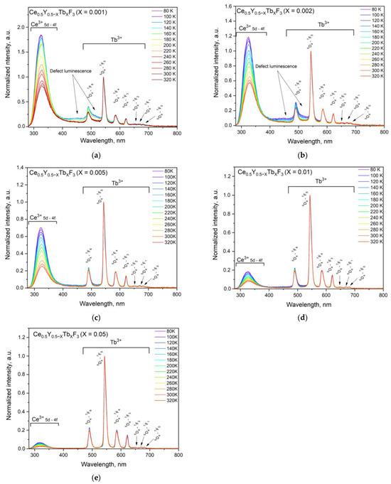 It can be seen that the shape of the spectra notably depends on temperature. The relative change in Ce3+ and Tb3+ intensities takes place. In particular, the Ce3+ intensity gradually decreases with the increase in Tb3+ concentration (Figure 8a–e). On the other hand, the above-mentioned broadband luminescence is also observed for Ce0.5Y0.5−XTbXF3 (X = 0.001 and 0.002) samples. The same broadband we observed in [25]. The difference in broadband intensities for different samples can be explained by the intense Tb3+ luminescence compared to the broadband intensity. In order to realize the ratiometric luminescence thermometry approach, the luminescence intensity ratio (LIR) of Ce3+ and Tb3+ peaks should be calculated. However, this broadband can be a notable drawback for the LIR calculation. In turn, the broadband does not affect the Tb3+ peak at 621 nm corresponding to the 5D4–7F3 transition. Thus, we calculated the LIR of Ce3+ (250–350 nm) and Tb3+ (615–625 nm). The LIR functions are presented in Figure 9.