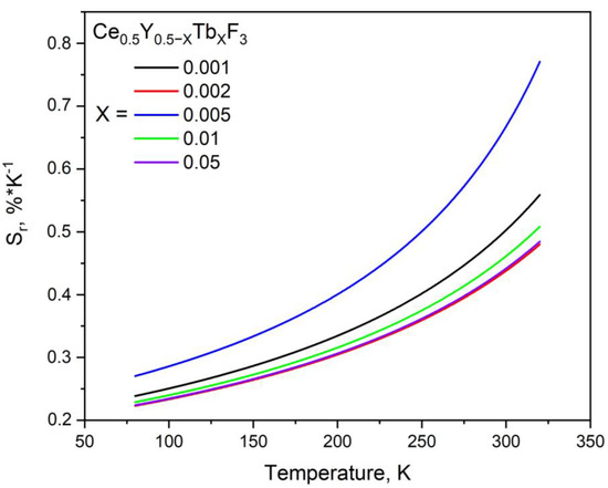 The decreasing character of the LIR functions can be explained by the different efficiencies of Ce3+ and Tb3+ thermal luminescence quenching. Indeed, as was mentioned above, due to the 5d–4f nature of Ce3+ luminescence, it has stronger electron–phonon coupling compared to Tb3+ f–f luminescence. However, the decay rates of the LIR functions notably depend on the Tb3+ concentration. Specifically, the rate decreases with the increase of Tb3+ concentration. Discussion of the obtained results necessitates an analysis of the chemical composition. Indeed, the chemical composition of the studied samples is complex. As was mentioned above, since the phase of the sample corresponds to CeF3, both Y3+ and Tb3+ substitute Ce3+ positions. In the case of the samples with lower Tb3+ concentrations (Ce0.5Y0.5−XTbXF3 (X = 0.001, 0.002, 0.005), it can be suggested that the majority of Ce3+ ions do not interact with Tb3+ ones. Hence, we observe the luminescence of “pure” Ce3+ without interaction with Tb3+, and the luminescence of Ce3+ that is in contact with Tb3+. In the case of Tb3+ luminescence, the Tb3+ excitation goes through ABEFG path (Figure 7). Finally, the dependence of LIR functions on Tb3+ content can be explained by the competition between the more temperature-dependent ABDA (Ce3+ thermal quenching) and the less temperature-dependent ABEFG paths. In order to obtain the quantity characteristic of the obtained samples, we calculated relative temperature sensitivity plots according to the convenient equation below: