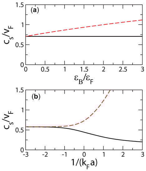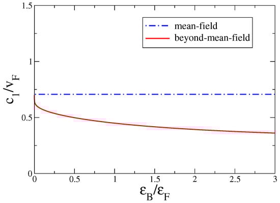 At zero temperature, the difference between Equations (28) and (45) is small in the 3D case, but it is instead very large in the 2D case, and in particular in the BEC regime of the crossover []. This effect is clearly shown in Figure 2, where we report the zero-temperature first sound velocity in the 2D BCS–BEC crossover, regulated by the binding energy of Cooper pairs. In Figure 2, the dot-dashed line is obtained by using the mean-field number Equation (45), while the solid line is based on the beyond-mean-field number Equation (28). In the strong coupling BEC regime, the beyond-mean-field equation of state is needed to accurately describe the thermodynamic quantities, and the corresponding first found velocity correctly goes to the correct composite boson limit [].