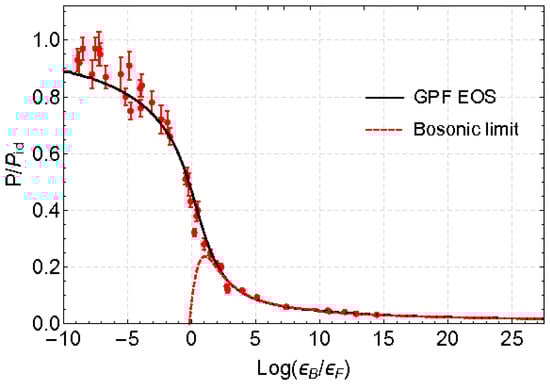 with given by Equation (26). Figure 3 clearly shows that, at zero temperature, the agreement between experimental data and our beyond-mean-field theory is very good in the full BCS–BEC crossover. In the deep BEC regime, the beyond-mean-field pressure becomes []