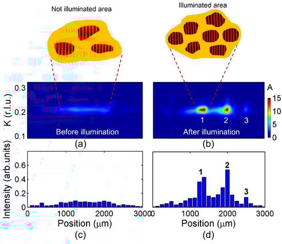 We irradiated three spots indicated by 1, 2, and 3 using an X-ray beam of 100 μm2 for a total fluence of 50 (1016 cm-2); the effects of this continuous local illumination are than monitored by re-scanning the sample using the low fluence of 1.5 (1016 cm−2). The results are shown in the map of Figure 4b by the 3 bright spots at the positions 1, 2, and 3 of increased integral intensity, respectively shown also in the histogram of Figure 4d.