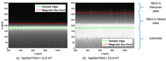The flux fronts were extracted by collecting the flux density profiles perpendicular to the sample edge (the Bean profiles) in 5 pixel-wide strips, subtracting any spurious constant “induction” value in the film centre so that the Meissner state corresponded to , and searching for the y-coordinate at which the measured flux density first rose above a defined threshold value (starting from the film centre). For vanishing , the flux front corresponded to the interface between the vortex-free Meissner state (dark upper part of the images in Figures 2, 3a,b, 5a–c and 6a–c), and the mixed state. It turns out however, that choosing too low a threshold value (typically, below 1.25 mT) is detrimental to the signal-to-noise ratio of the extracted data; the camera noise rather than vortex progression influences the features of the determined front. For all experiments, we therefore extracted the magnetic flux fronts for a series of values of between 1.5 and 15 mT. In each image, the sample boundary position was verified as the y-value at which the maximum of the sharp induction peak due to the demagnetizing field was observed.