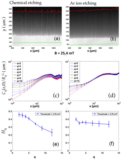 Figure 3 compares the penetration of magnetic flux from the long edges of film Y0T, defined by the chemical (left-hand panels (a,c,e)) and ion etching procedures (right-hand panels (b,d,f)), respectively, at a constant applied magnetic field of mT. In both cases, the front is defined by mT. Panels (c) and (d) display the higher-order spatial correlation functions (Equation (4)), for q values from 2 to 12, evaluated for the flux fronts progressing from the different edges. Here, and throughout the manuscript, the spatial correlation functions were obtained by averaging over the 45 different configurations of the progressing front, one for each value of the applied magnetic field, for a total length of 45 mm. The averaged correlation functions were normalized by the Gaussian factors [17,36], where terms are the saturation values of that would be obtained for an interface with a Gaussian probability density function of the local displacements [28]. The results show clear power-law scaling, which terminated at a saturation length of m. The power-law scaling also broke down for the very lowest distances (<m), at which the correlations were drowned in the noise. Measurements on different sub-sections of the flux front yielded somewhat different power laws; the results illustrate those most frequently observed, which also corresponded to the average behaviour.