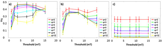 Dependence of the generalised Hurst exponent on the value of , which is varied from 1.5 to 15 mT, for different orders q. The exponents are determined from data equivalent to those in Figure 3, collected on the chemically etched (a) and the ion-etched boundaries (b) of the non-irradiated reference film Y0T, and on the ion-etched boundary of film Y2T. (c) shows as function of for the front emanating form the ion-etched boundary of film Y2T.