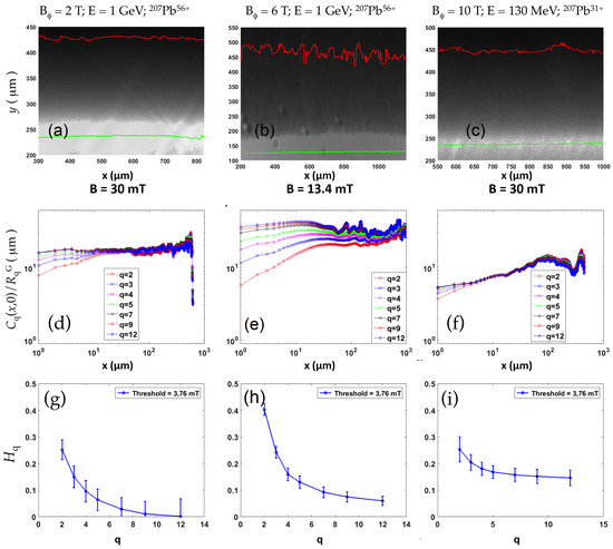 Results obtained for the flux fronts progressing from the edges defined by chemical etching on YBaCuO films Y2T (irradiated with cm 1 GeV Pb ions, under applied magnetic field of 30 mT; left-hand panels), Y6T (irradiated with cm 1 GeV Pb ions, under applied magnetic field of 13.4 mT; central panels), and Y10T (irradiated with cm 130 MeV Pb ions, under applied magnetic field of 30 mT; right-hand panels). (a–c) Magneto-optical images of flux penetration. (d–f) Higher-order moments of the spatial correlation function (Equation (4)), normalized by the Gaussian ratios [17,36]. (g–i) Generalized Hurst exponent as a function of the order q.