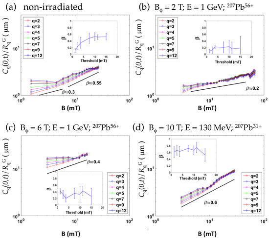 We now turn to the analysis of the “temporal” correlations, . Figure 7a–d shows the q-th moments for flux fronts advancing from the chemically etched boundaries of the four studied films. Weak multiscaling is observed for the three films (Y0T, Y2T and Y10T) with the weakest disorder. The values of the growth exponent obtained from a power-law fit to lie between 0.2 (film Y2T) and 0.6. The strongly disordered film Y6T has an intermediate value of . Similar results were found for the flux fronts emanating from the ion-etched boundary, as shown in Figure 8.