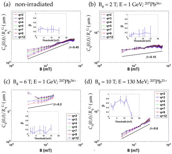 Figure 5 presents the magnetic flux penetration into the three heavy-ion-irradiated films, in each case, from the boundary defined by the chemical etching procedure. As above, multiscaling of the higher-order moments of the spatial correlation function (Equation (4)) is observed. In the case of the two films with the lowest amount of disorder, that is, Y2T irradiated with 1 GeV Pb ions ( cm) and Y10T irradiated with 130 MeV Pb ions ( cm), the small-distance behaviour of , as well as the q-dependence of the Hurst exponent and the values of and , are all very similar to that found in the unirradiated film. This indicates that the disorder in the vortex ensemble and the subsequent roughening of the flux front was, principally, introduced by the features of the film boundary. In the film exposed to 1 GeV Pb ions ( cm) and containing columnar defects with a dose-equivalent field of = 6 T, however, the fanning out of the curves at small distances is much more marked. The saturation length m is somewhat smaller, no clear crossover regime is observed, and the drop of from 0.45 to 0, as q increases, is more rapid. We note that the critical current density (46 K) A·m of this film is much smaller, presumably because of stress induced by the heavy ions implanted in the LAO substrate.