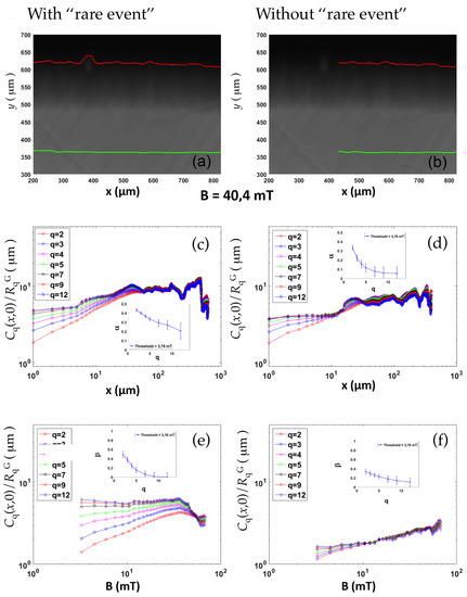 Flux penetration from the chemically etched boundary of film Y2T, in a section that includes a particularly marked defect or rare event. The latter causes the bulge in the left-hand side of the flux front (a,b). Taking the rare event into account results in pronounced multiscaling of the spatial correlation function , while ignoring it does not (c,d). The panels (e,f) show the corresponding growth exponents. The resulting Hurst exponents are depicted in the respective insets.
