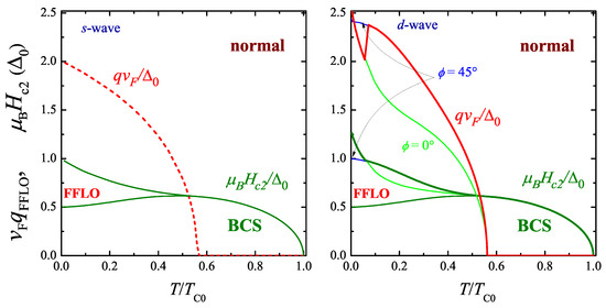 is the temperature of the onset of the superconductivity in the pure Pauli regime, , and is the angle the q vector makes from the x-axis. The and the modulation vector, maximizing , are illustrated in Figure 1. In the case of an s-wave superconductor (obtained from Equation (15) by substitution )