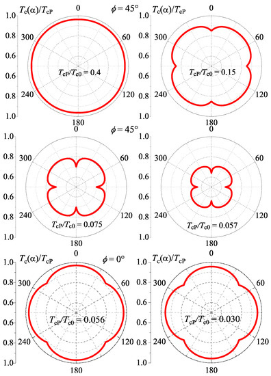 As it was intuitively expected, the orbital effects reduce the superconducting onset temperature, in both cases. While increasing the applied magnetic field, first decreases in most cases until the tricritical point, , is reached [77]. At the function strongly depends on the in-plane effective mass anisotropy (not considered here and investigated in [42] and angle (and this is very different from the conventional phase). For some angles, may exhibit an upturn and may approach the paramagnetic limit, , when H increases. In contrast, for small an increase of the magnetic field leads to a decrease of . For intermediate angles, can be a non-monotonic function of the field strength. One can infer that the strong field-direction dependence of the superconducting onset temperature, , appears at high magnetic fields when the FFLO state develops, while it is absent at low fields.