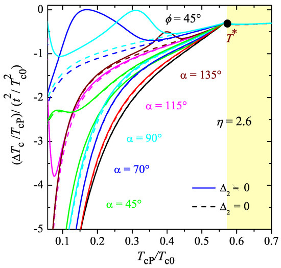 In real systems, the crystal field effect is inevitably present and influences the pinning direction of the FFLO modulation [68,69]. As already mentioned previously, the orientation of the FFLO modulation vector is arbitrary in the pure Pauli limited regime for an elliptic Fermi surface (s-wave case). The crystal field introduces deviations from the ellipticity and pins the FFLO modulation vector in a certain direction. In the case of a d-wave superconductor and weak crystal effect, it can lift the four-fold degeneracy of the direction of FFLO modulation, making it two-fold. To illustrate this, we pin the FFLO modulation vector along the directions and investigate the anisotropy of the superconducting onset in the temperature range . Figure 7 displays the orbital-motion induced normalized correction of the transition temperature, , as a function of normalized temperature, , for several orientations of the applied field (for both s-wave and d-wave cases). Here, the crystal field effect is sufficient to break the four-fold degeneracy to fix the direction of the FFLO modulation vector. The dashed lines illustrate the result for , considered in this section, while the solid lines are the solutions with , discussed in the next section.