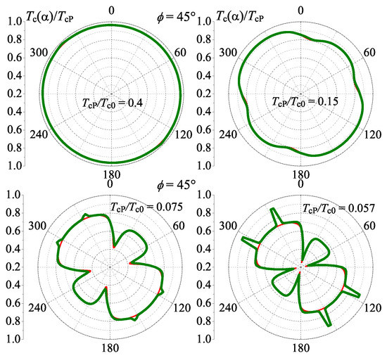 The resonance effect results in particular features of the anisotropy of the superconducting onset temperature induced by the spatially modulated FFLO phase. The thick curves in Figure 8 and Figure 9 show the magnetic field angular dependence of the normalized superconducting transition temperature, , when accounting for the second harmonics of the order parameter, . We see that, in addition to the overall anisotropy induced by the FFLO modulation and studied in [42], cusps develop for certain directions of the applied field, when the resonance conditions are realized. These cusps are the result of the resonant interplay between the FFLO wave vector and the magnetic wave vector, when the orbital effects of the field are taken in the second-order approximation.