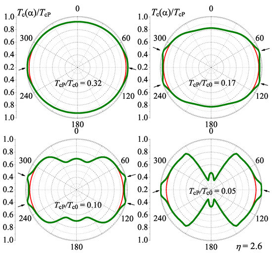 where, for the values are chosen that maximize the critical temperature. Usually, the second harmonic of the order parameter, , can be neglected because the developed theory is valid up to the second order with respect to , and because ≲ . In this case, the solution of the system is just , as it was shown in the previous section. However, if (the resonance condition), the term in the l.h.s. of Equation (30) is of the same order as the corresponding term in Equation (29) (up to the second order with respect to ). Consequently, becomes on the order of , and one has to consider both equations in the system on equal footing [81].