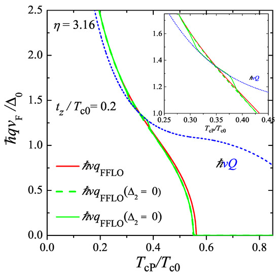 So far, we have assumed that the absolute value of the FFLO wave vector might be determined in the paramagnetic limit only. However, the orbital contribution, in its turn, may influence the absolute value of the FFLO modulation vector. Making use of Equations (29) and (30), we may optimize its solution with respect to the vector q. The result of the calculations are depicted in Figure 11, which illustrates the modulus of the FFLO wave vector versus the reduced temperature. One can see that the orbital effect on the modulation vector is weak except for the region in the close proximity to the resonance, , where it may strongly influence the FFLO structure [88,89]. In the vicinity of the resonance, where the unperturbed q and Q curves intersect, an interesting lock-in effect appears: two wave vectors hybridize.