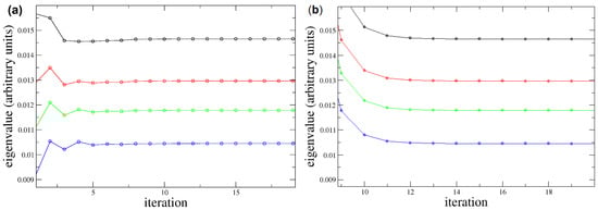 (a) Series-corrected solution; (b) Hodge symmetric solution; each color identifies a specific eigenvalue .