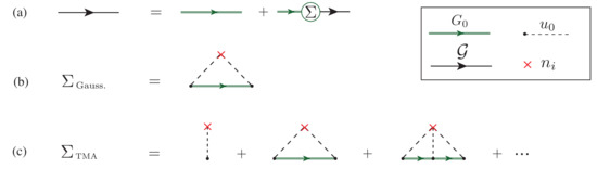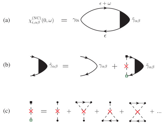 The disorder average in Equation (24) is evaluated by means of the diagrammatic technique (Figure 3). For brevity of notation, we first present the formalism within the Gaussian approximation for the self-energy, Equation (16). In Section 2.3, we provide the connection with the full T-matrix result.