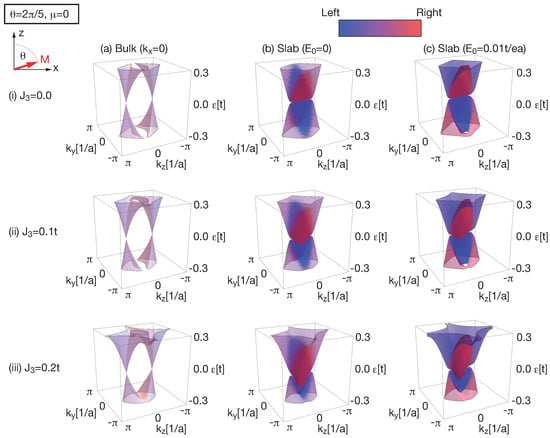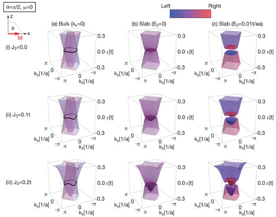 where are exchange coupling constants and is a unit vector representing the direction of magnetization. In this work, is set on the x-z plane, as shown in Figure 1a. The first term is a usual exchange coupling and the second term originates from non-equality of the exchange coupling constants between two orbitals considered here, i.e., p-orbitals of (Bi, Sb) and (Te, Se). In magnetic topological insulators [,,], Cr atoms are substituted for Bi or Sb atoms. As a result, there is the non-equality of exchange coupling between p-orbitals of (Bi, Sb) and (Te, Se). The total Hamiltonian is given as