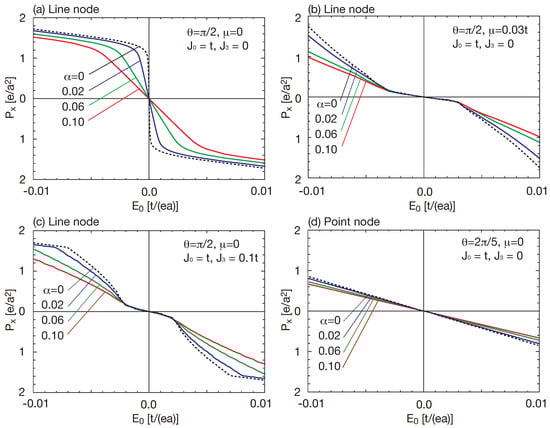 Using the self-consistently derived electronic states, we calculate the electric polarization in the slab system. Figure 5 shows the electric polarization as a function of the external electric field for several parameters. In the nodal line semimetal (Figure 5a), we see that the system exhibits non-linear electric polarization. In the absence of the screening effect , the electric polarization abruptly changes at . In the bulk limit, the electric polarization is induced by infinitesimal electric field and discontinuously changes at . However, in our numerical calculation, the electric polarization continuously changes at because of the finite size effect. In the presence of the screening effect, the step structure is broadened and the electric polarization vanishes at . However, the kink structure of the electric polarization is preserved. Figure 5b shows the electric polarization for finite chemical potential . Even in the finite chemical potential, the kink structure is observed, though the kink appears at a finite electric field. This kink structure is broadened by the screening effect. In finite term (Figure 5c), the surface bands are bended and the situation is similar to the finite chemical potential case (Figure 5b), so that the qualitative behavior is the same. In the nodal point semimetal (Figure 5d), the electric polarization is proportional to the external electric field and there is no kink structure. Therefore, the kink structure is characteristic to the nodal line semimetals and is closely related to the topological property of the system.
