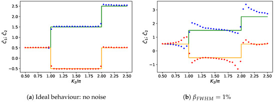 For an AOKR with two internal degrees of freedom, the kicking potential induces a relative light shift, acting as an additional dynamical phase, which must be compensated in order to implement the ideal evolution described by the Hamiltonian (1) [42]. The compensation is done by the coin matrix rotating the internal degree of freedom—see [29,42] for details. The fluctuations in imply that the light-shift phase differs from kick to kick. At the jth step of the walk, it will be