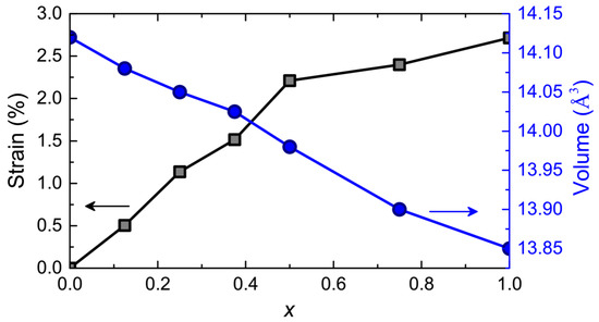 The atomic volume decreases linearly from 14.12 Å in SmCo to 13.84 Å in CeCo with increasing x, whereas the strain increases correspondingly monotonically with increasing x (see Figure 2). Result that decreased volume by Ce concentration well corresponds with ref. [31] which presented that CeCo compound stands out as a anomalous in the lattice constants. Due to lanthanide contraction, smooth decrease in atomic volume can be expected through the series from lanthanum to terbium in the periodic table, however, there is a pronounced deviation for CeCo. In our related research [28], we found substitution-induced tensile strain on SmCeCo has drastic effects on the magnetic state. While the decreased magnetic moment for CeCo have been interpreted as evidence for a mixed-valence behavior of the Ce ion [32,33], the effective occupation number of the 4f orbitals can be determined by induced strain rate.
