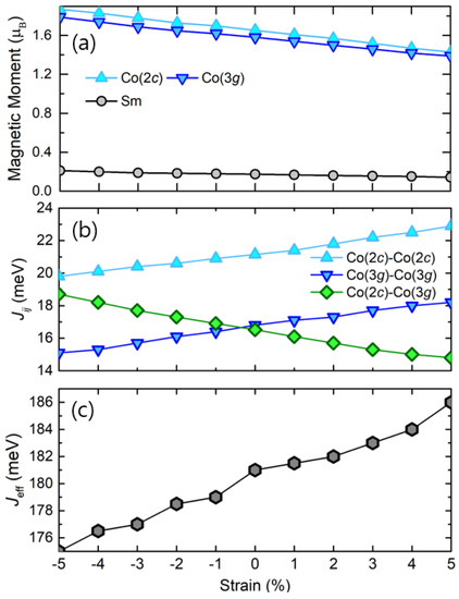 Importantly, any substitution of Co with another TM reduces the effective ferromagnetic exchange coupling and consequently reduces . This is highly undesirable because the most important application field of Sm-Co-based magnets is that of high temperature. Hence, it is vital that we find a way to enhance the magnetic performance in Sm-Co magnets without substituting away the Co, but by carefully modifying the local atomic arrangements, by introducing strain. Strain is a particularly important issue for permanent magnets, because their synthesis typically involves sintering, and thermal processes inevitably introduce strain on fine-grained materials [23,24]. Strain effects are also associated directly to partial element substitution, such as e.g., of Sm with another RE metal.