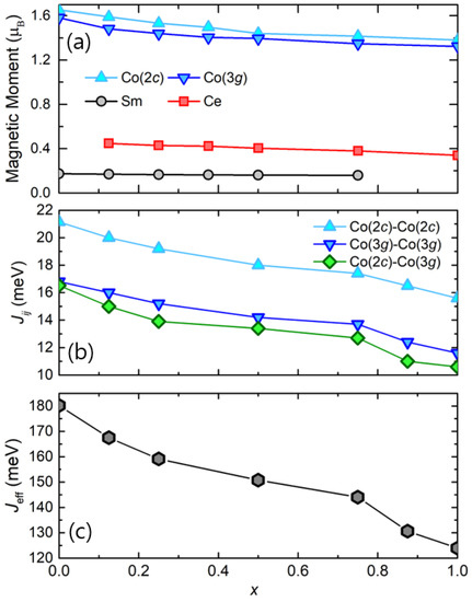 Magnetic properties as a function of Ce-substitution of Sm: (a) atomic magnetic moments of Co atoms at sites 2c (triangles) and 3g (inverse-triangles) and Sm atoms (circles); (b) exchange coupling between Co sites i and j; and (c) effective total ferromagnetic exchange energy.