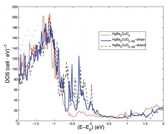 The total density of states (DOS) functions at the Fermi level for three supercells of the doped Hg-based cuprate are shown in Figure 1. The undoped DOS agree with the DOS calculated previously for one unit cell of HBCO using also  states for the Ba sites [].