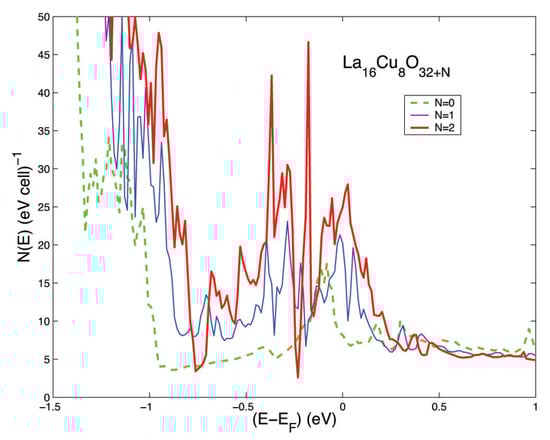 - Jarlborg, T.; Bianconi, A.; Barbiellini, B.; Markiewicz, R.S.; Bansil, A. Effects of Excess or Deficiency of Oxygen Content on the Electronic Structure of High Tc Cuprates. Journal of superconductivity and novel magnetism. J. Supercond. Novel Magn. 2013, 26, 2597. [Google Scholar] [CrossRef]