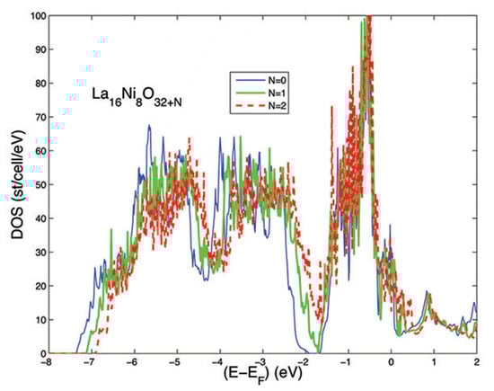 The addition of two ordered or disordered  in the cell makes new states to appear near  in the interval −0.6 to +0.2 eV, see Figure 1. Therefore, it is not possible to judge about the effects of doping on the FS from these DOS functions. However, it is possible to see that the d-band edge near −1 eV moves to the right, about 0.1 eV, when two ordered  have been added. This is an indication of an effective hole-doping, i.e., equivalent of moving  to the low energy side in the standard cuprate DOS. This finding is less evident for the disordered case. The evolution of the DOS with doping in LCO and LNO can be seen in Figure 2 and Figure 3.