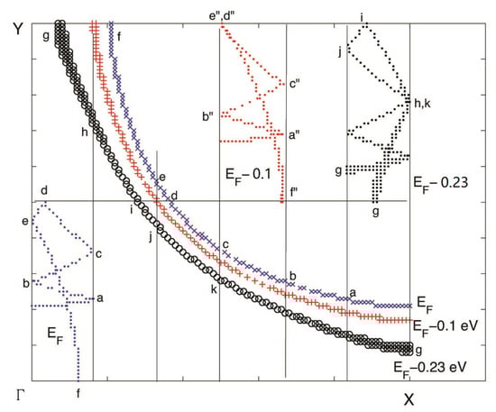 To reveal the effect of doping on the FS, we compare the FS of real calculation for the supercell with that of the folded FS of the simple FS as calculated for the single unit cell. The FS for one unit cell of HBCO is shown in Figure 4. Three circular FSs are shown within one quarter of the BZ, all centered at the upper right corner of the BZ. One FS with the largest radius is for the calculated , and two smaller FSs are for assumed larger hole-doping when  are 0.1 and 0.23 eV lower. Each of the smaller panels of Figure 4 shows the extent of the BZ of the 6 × 2 supercell, and in three of them we show how several folded Fermi surfaces would look like after folding. In the case of intermediate doping, shown by  eV, one can note that the points marked as i and j in the FS at  (or e and d in the FS for  eV has merged into one point (marked by  and ). This merged feature also appear in the FS calculated for the doped cell with ordered , see Figure 5. The folded FS for  (indicated by + signs) agree well with the real FS for the supercell (indicated by o-signs) almost coincides near the Y-point, which is an evidence of merged branches. Also, at the X-point there is a good agreement, which is an indication of a FS with a radius close to what is indicated by f and  in Figure 4 for the case  eV. The FS structures for folded and real FS in the middle of Figure 5 have the same shapes. This shows that a circular FS survives despite the doping of ordered , but that the radius near point b in Figure 4 should be a bit smaller, i.e., the circle seems to slightly retract near this point.